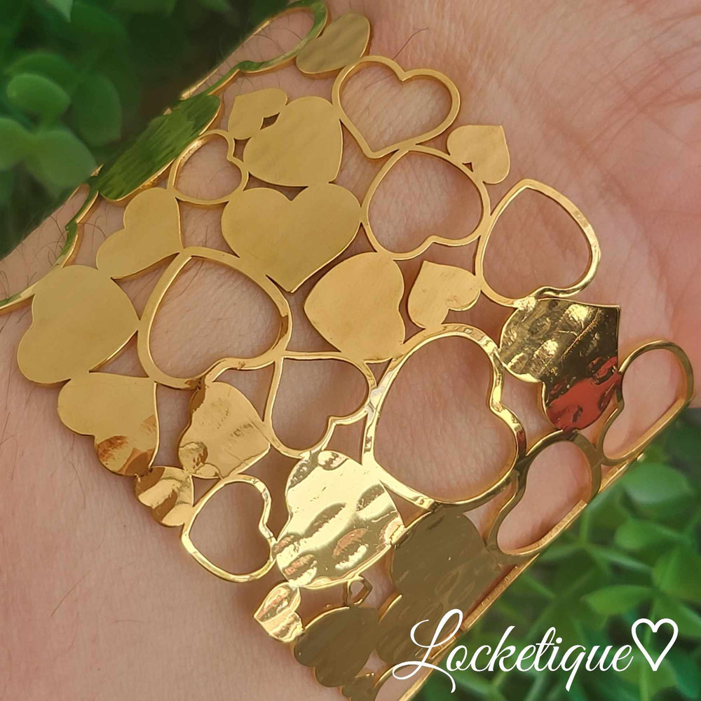 Embrace elegance and affection with the Locketique Luxe SS Cuff Bangle in a stunning "Loves of Life" design. This exquisite bangle, crafted from high-quality 316L stainless steel and plated in luxurious gold, features an intricate pattern of interlocking hearts that symbolize love and connection.