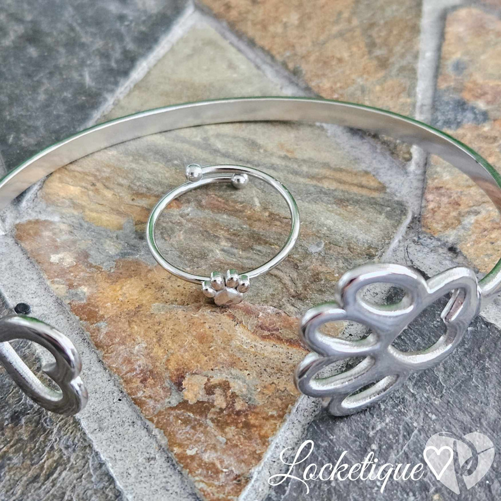 Celebrate your love for animals with the Luxe SS Cuff Bangle Set - Huellitas. This delicate set features a beautifully crafted paw print design on both the cuff and ring, perfect for animal lovers who want to add a personal touch to their accessories. Made from high-quality stainless steel 316L, this set provides a lasting shine and durability, ensuring it remains a staple in your collection for years to come.