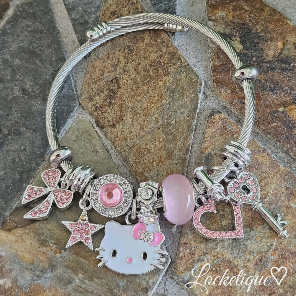 This elegant stainless steel charm bracelet features a timeless cable-wire design accented with polished silver-tone details. The bracelet is beautifully adorned with a curated selection of pink-themed charms, creating a delicate yet playful aesthetic.
